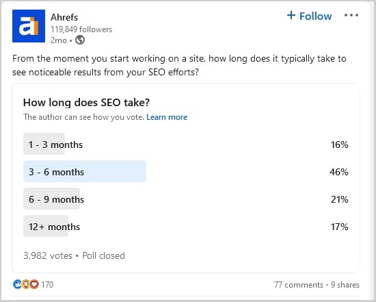 A LinkedIn survey by Ahrefs, which garnered responses from nearly 4,000 participants, added more weight to the ongoing effort required for solid SEO.
